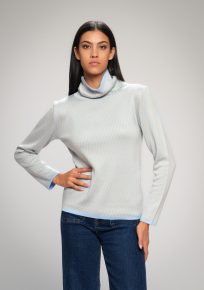 Ženski džemper od vune u formi jaknice ili sakoa, sa jako zanimljivim detaljima koji celokupan izgled diže na viši nivo stila i prefinjenosti.